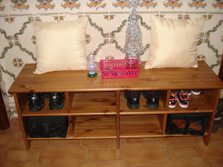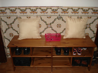 Na entrada tenho um móvel onde colocamos os sapatos assim que entramos, é um hábito calçar os chinelos assim que chegamos, até o Miguel já sabe que quando chega tem de calçar os chinelos:,-)